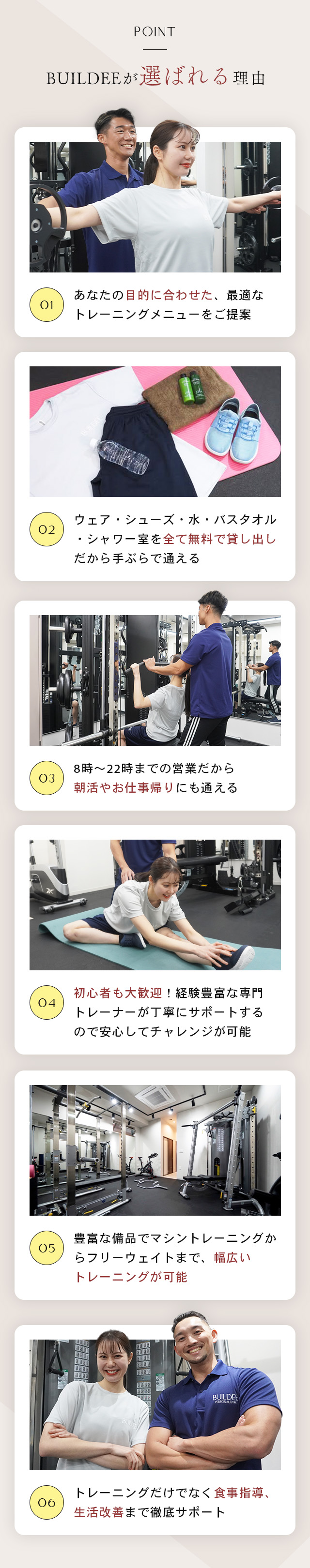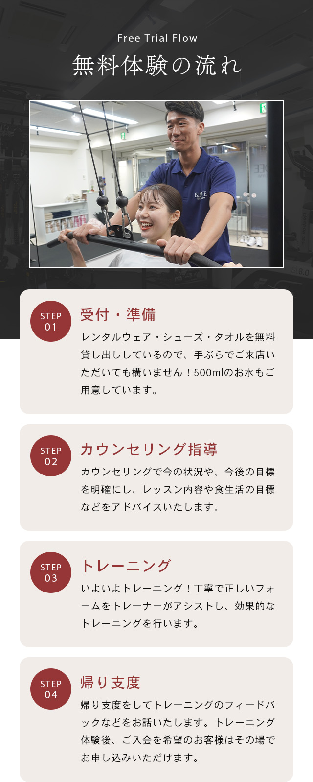 全く問題ございません。パーソナルトレーナーがお客様の体力レベルに合った安全な指導を心がけておりますのでご安心ください。